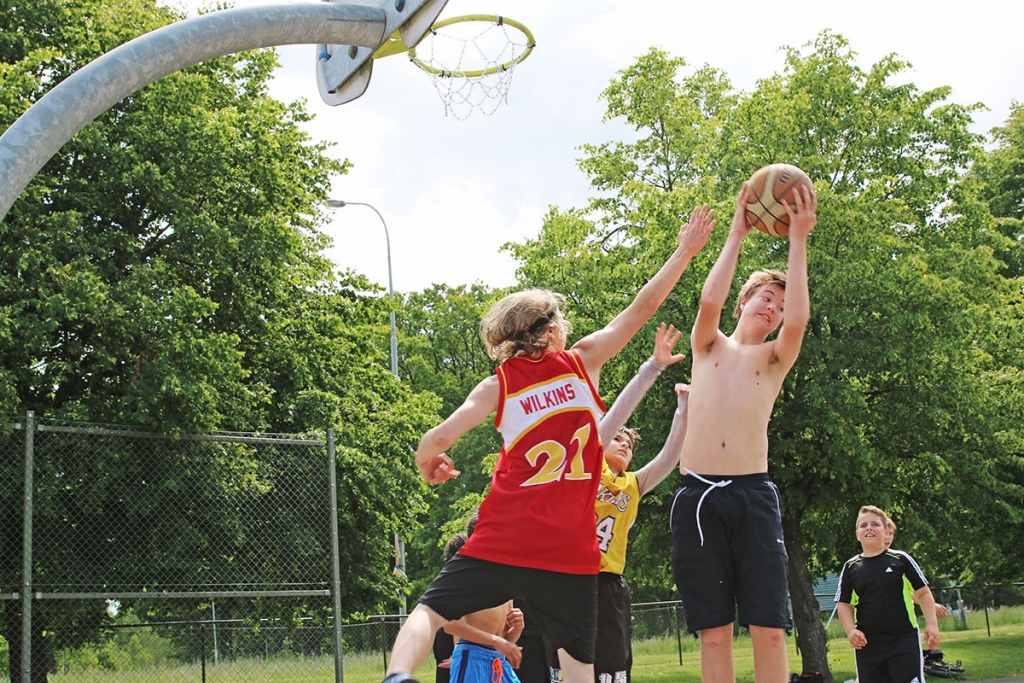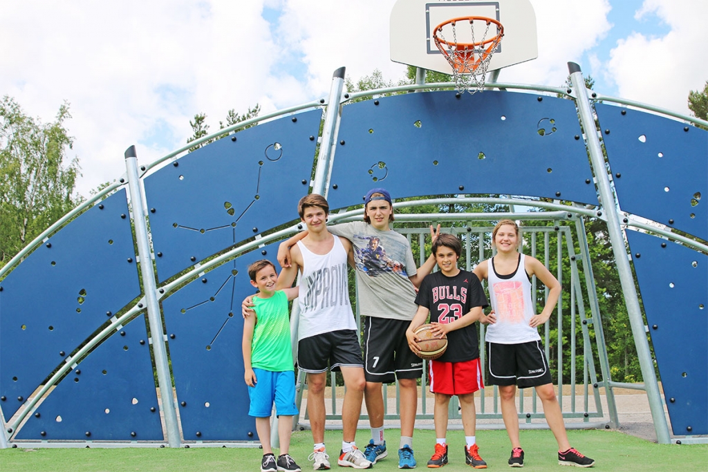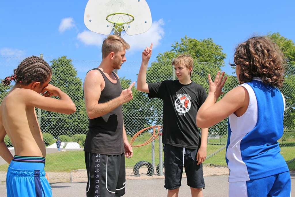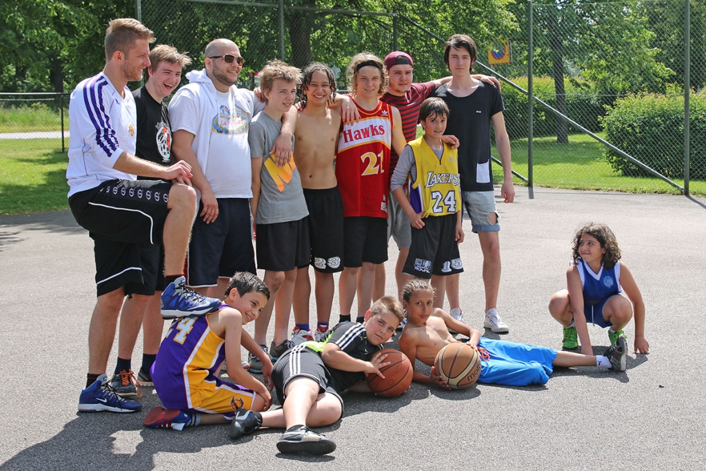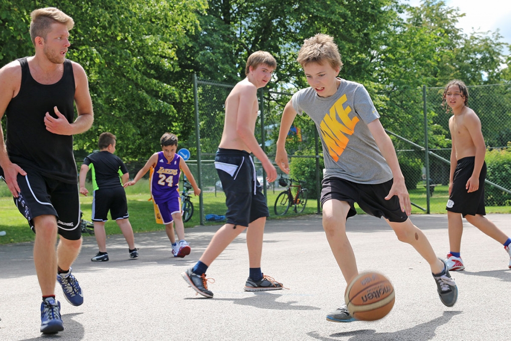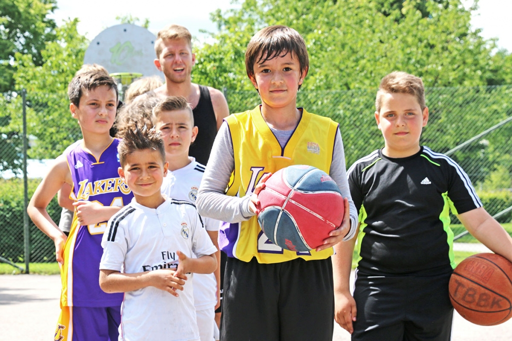 På Hjortmossens nybyggda basket- och fotbollsplan står fem personer i varierande ålder - och längd - och gassar under solens strålar. Här har representanter från Trollhättans Basketbollklubb de senaste veckorna varit på plats för att lära ut kunskap som kärlek om basket.